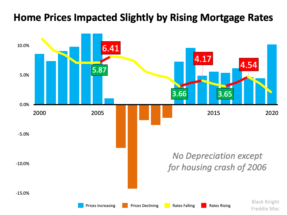 Another topic that’s generating frequent headlines is the rise in mortgage rates. Some people are expressing concern that rising rates will negatively impact the housing market by causing home sales to dramatically decline. The resulting headlines are raising unneeded alarm bells. To counteract those headlines, we need to take a look at what history tells us. Looking at data over the last 20 years, there’s no evidence that an increase in rates dramatically forces sales to come to a halt. Nor does home price appreciation come to a screeching stop. Let’s look at home sales first:
